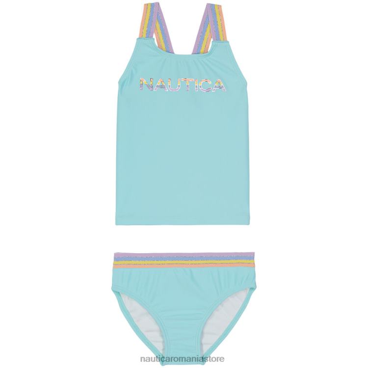 Acest set tankini din două piese este confecționat cu țesătură de până la 50+ pentru a o proteja atât în apă, cât și în afara acesteia. are un logo cu dungi colorate în față și bretele elastice largi, care se extind în V în spate pentru confort și sprijin.
