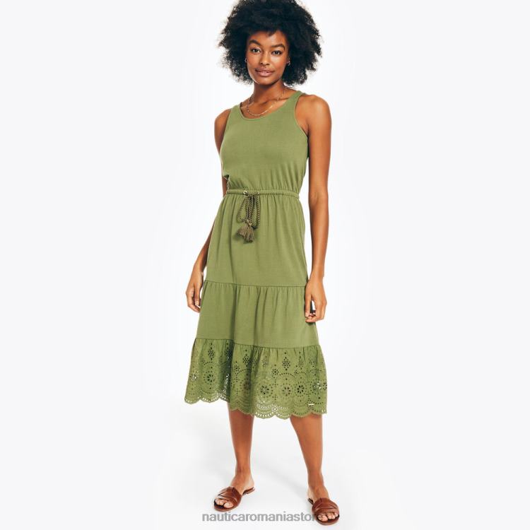 Confecționată din bumbac texturat, această rochie midi are o margine cu ochi la tivul cu etaje și o talie cu șnur elastic pentru o potrivire confortabilă.